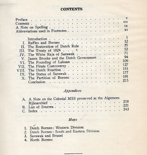 The Dutch were the first European colonists in Borneo, but had to withdraw for about ten years because of the Napoleonic Wars at the beginning of the century. When they returned, Borneo was not a high priority until the arrival of James Brooke in Sarawak. Based on both British and Dutch archival records, the author, a former academic with the University of Malaya, traces the subsequent power struggle on the island. Thread bound Paperback Reprint. Originally published in 1955 251 pages . For further details, please see the scanned contents page.